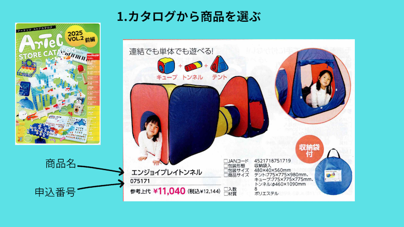 まずはカタログからご希望の商品と申込番号(注文番号)をご確認ください。