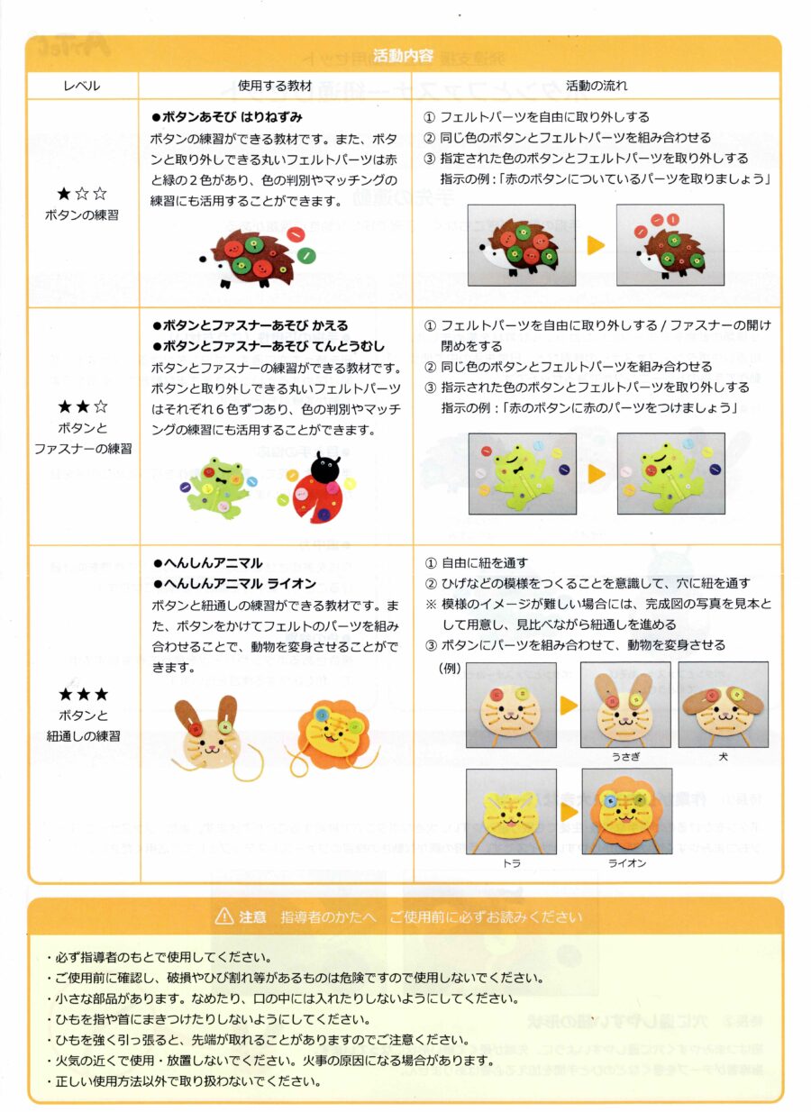 複数色あるボタンやパーツを使って作業する中で、色を区別する練習をします。
