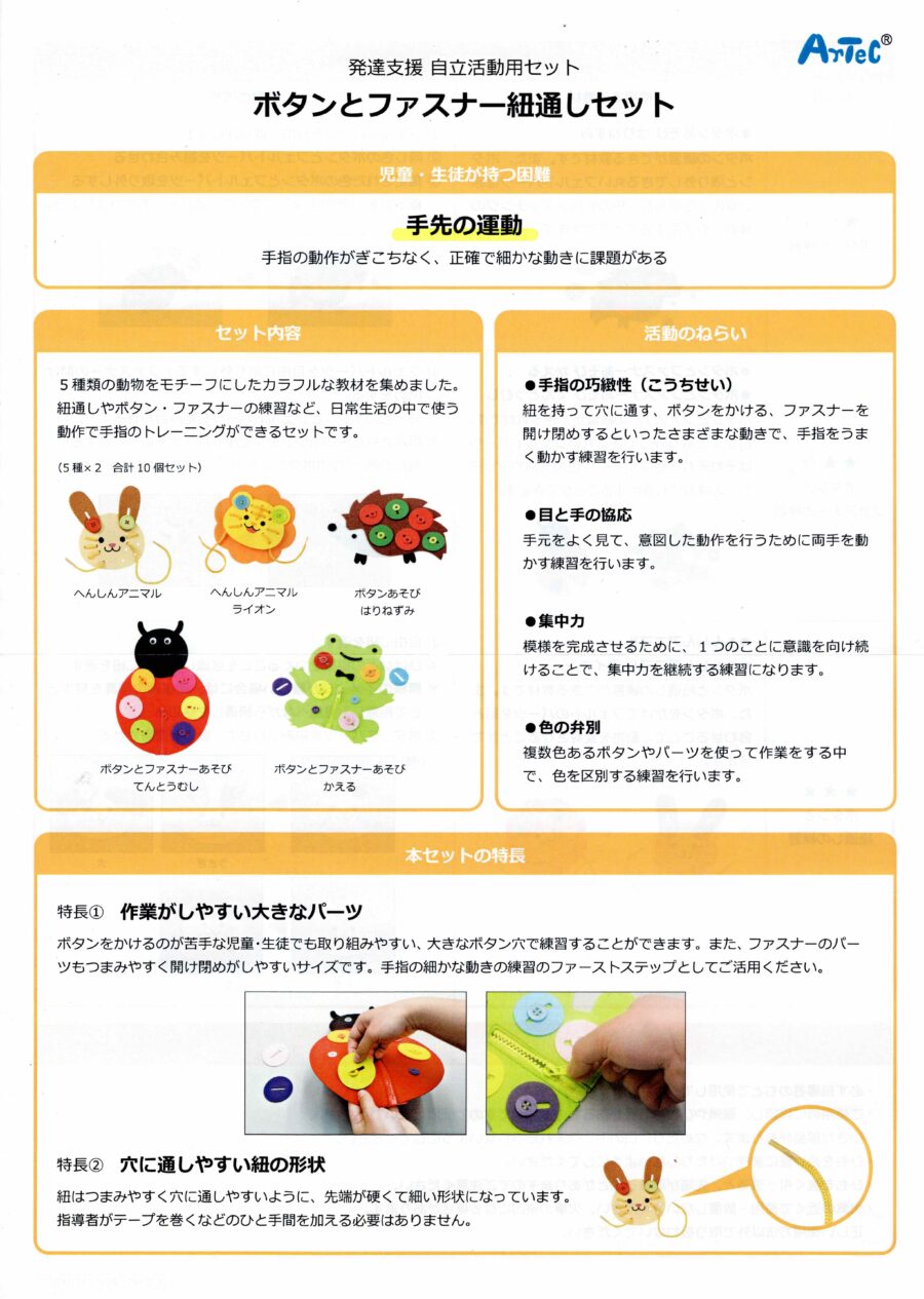 手指の動作がぎこちなく、正確で細かな動きに課題のある子におすすめです。学校の自立活動にも使われていますが、家庭でも手と指、そして目を使って遊びながら練習することができます。