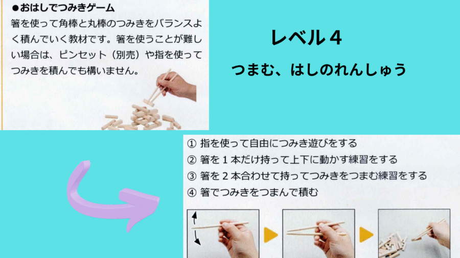 簡単な動作から箸の練習まで、子どもに合わせてステップアップできます。