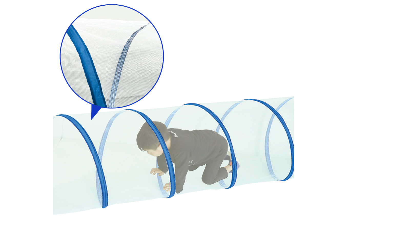 トンネルを通り抜ける遊びは、狭くて細長い空間にぶつからないように四つ這いになって体を動かすことで、ボディーイメージの発達を促します。