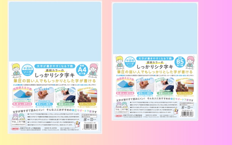 B5:182×260mm A4:210×300mm 厚さ0.5mm(A4、B5共通)/再生PET製/日本製/監修 作業療法士 鴨下賢一/製造販売 株式会社オフィスサニー/ 特許出願中(特願2021-000053)