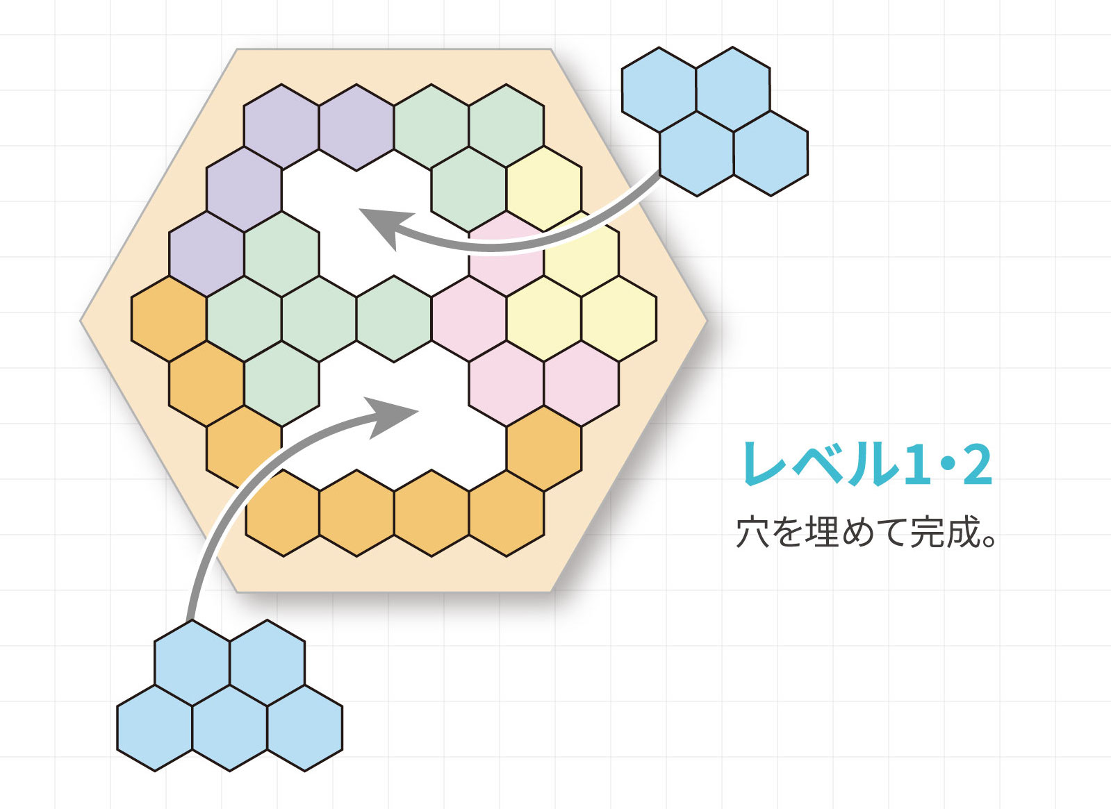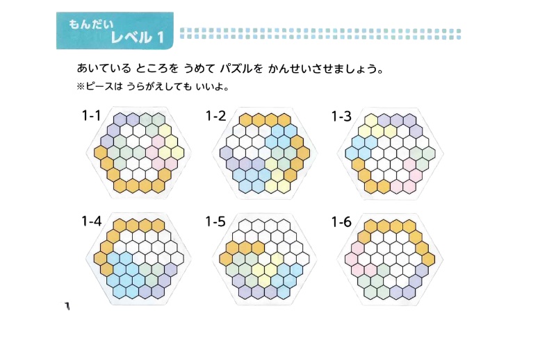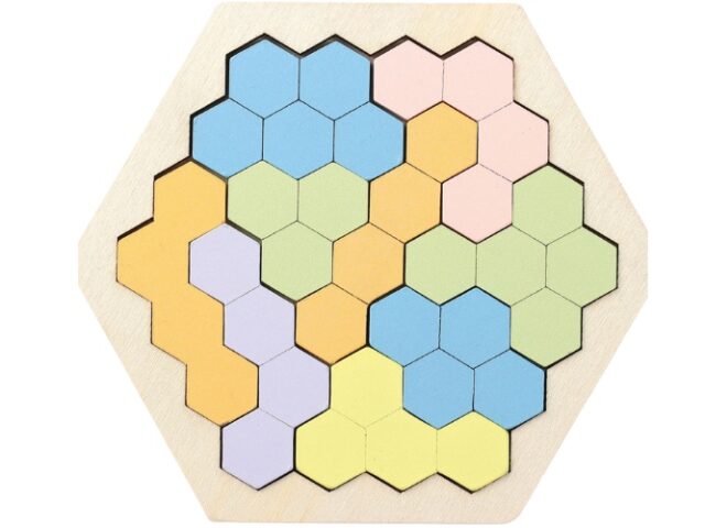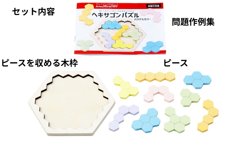 ヘキサゴンとは六角形のこと。小さな六角形同士を組み合わせて、大きな六角形の枠にピースを埋めてパズルを完成させます。完成パターンは数百通り。図形感覚が身につくほか、論理的思考も育てます。