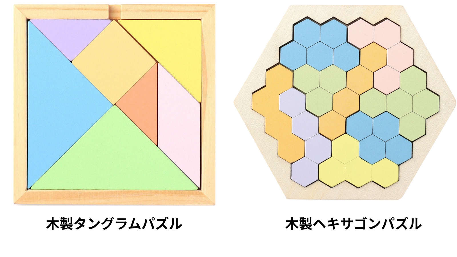 手と目を使って、形を意識し、空間認知力を養う「木製タングラムパズル」と「木製ヘキサゴンパズル」。どちらも発達段階に合わせて遊べます。特別支援学校の先生たちが絶賛しているパズルです。