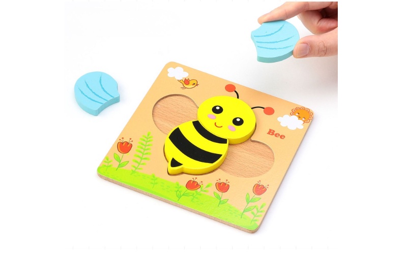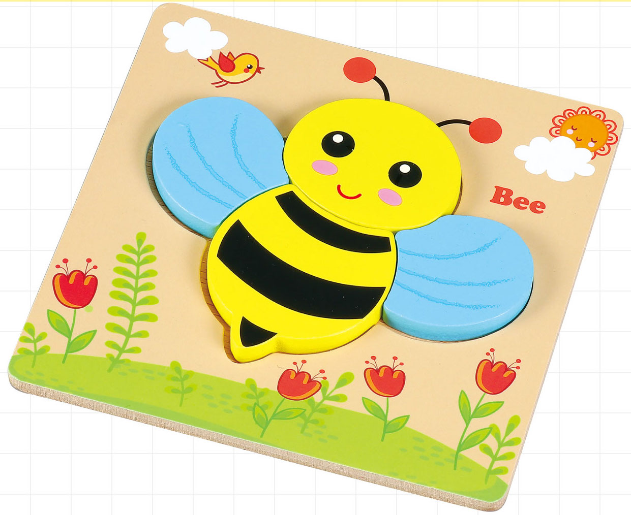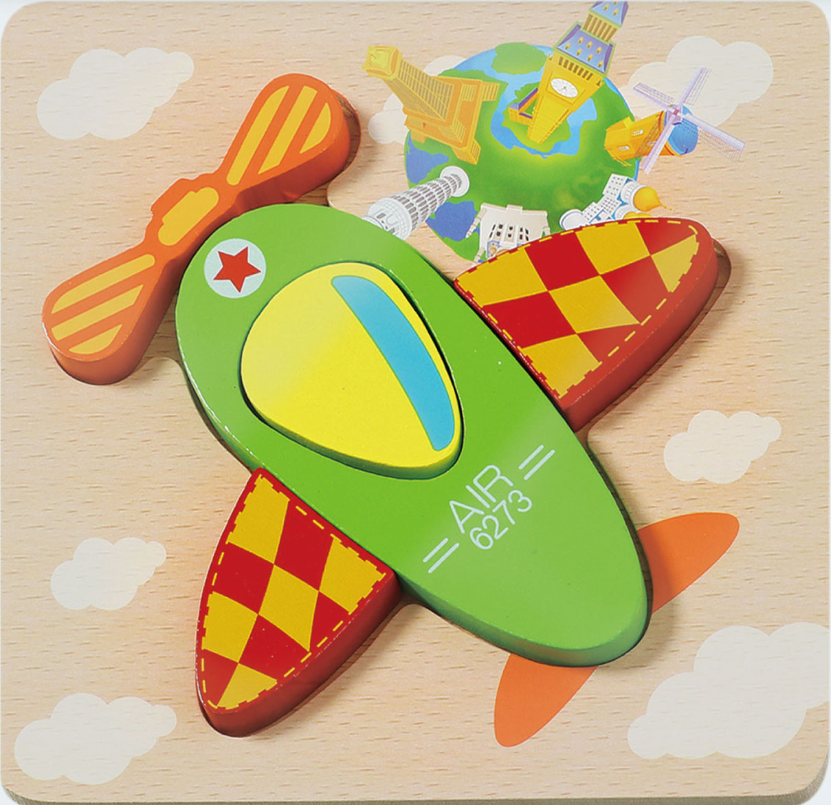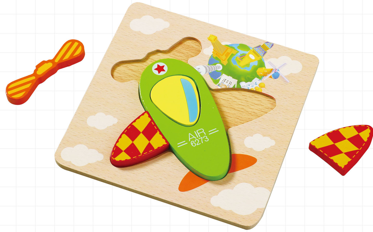円、三角、四角形などの木片を、同じ形に凹んだ板(はめ板)に、はめこんでいくのが一般的な型はめパズルです。目と手を使って形を認識する力や集中力を養います。