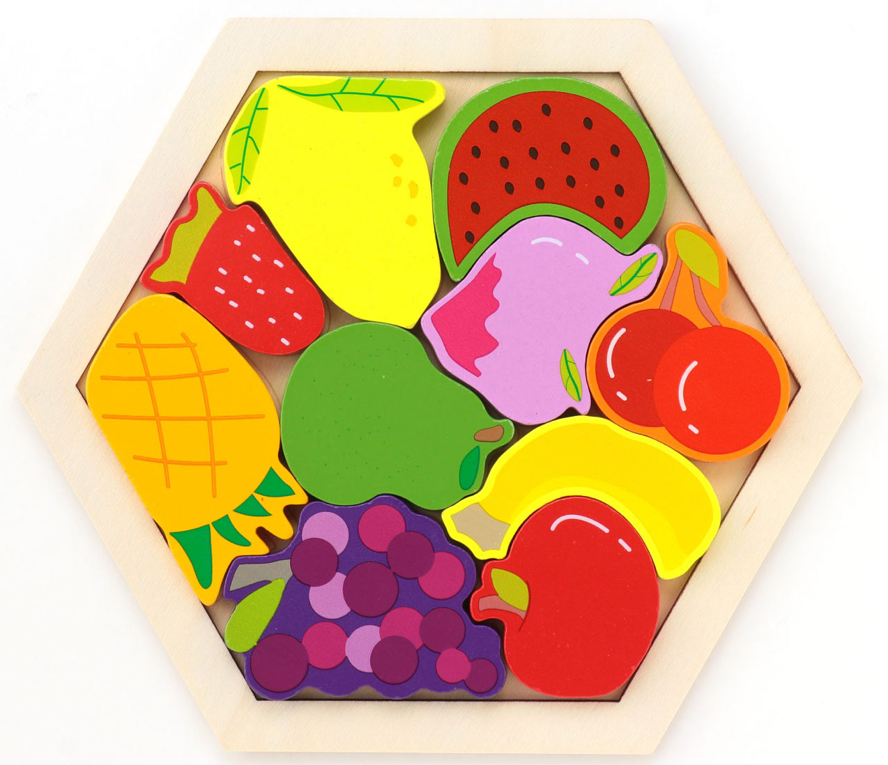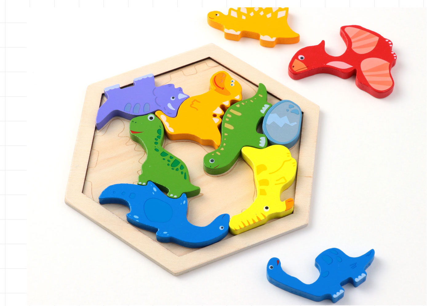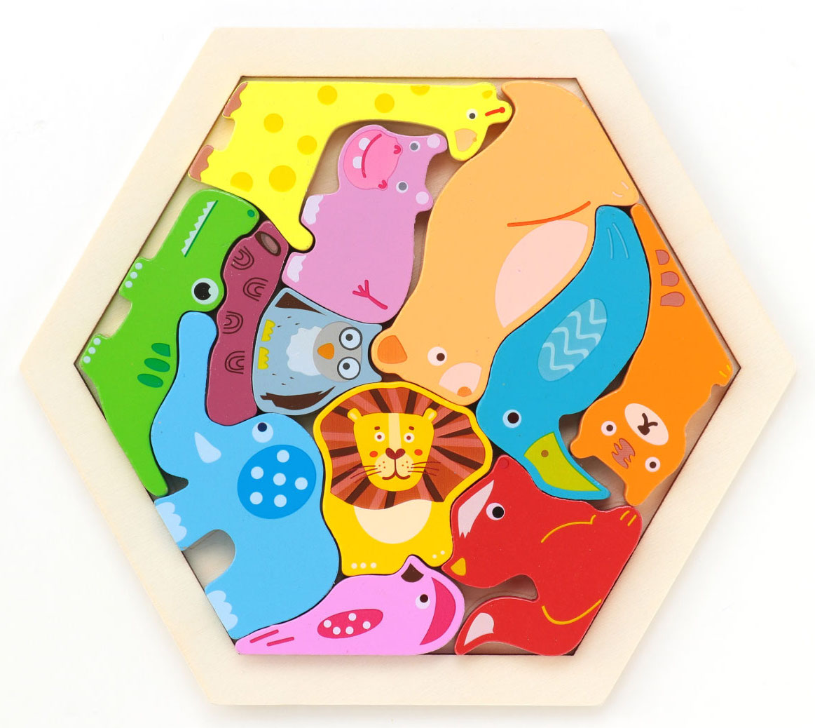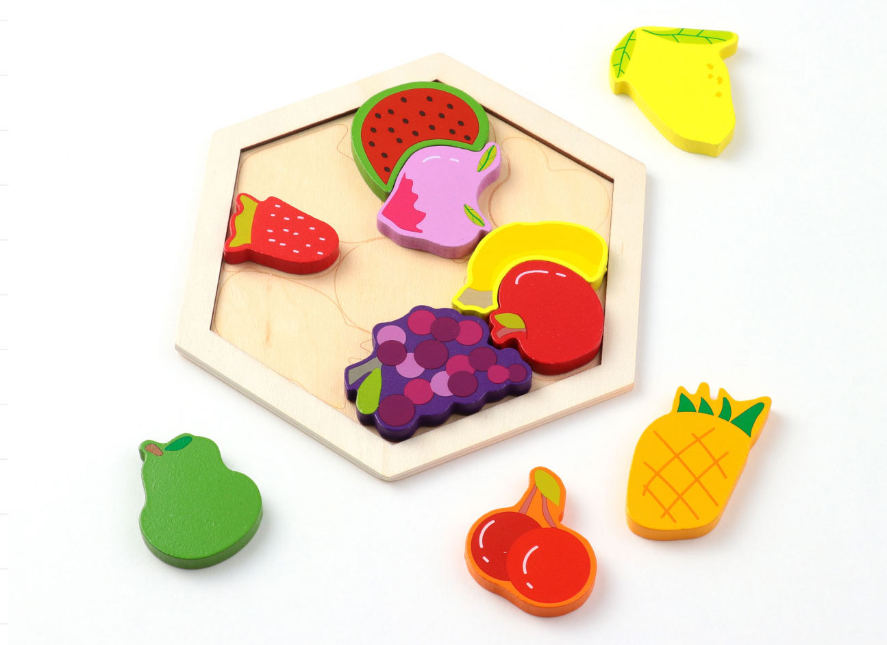 板にプリントされた形に合わせて、六角形いおさめるパズルです。パズルはもちろん、モノの名称を覚えたり、形を触ることでモノの特徴への興味にもつながります。