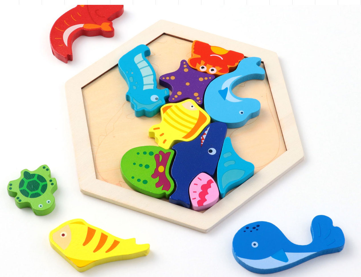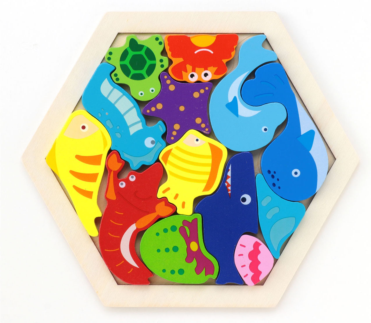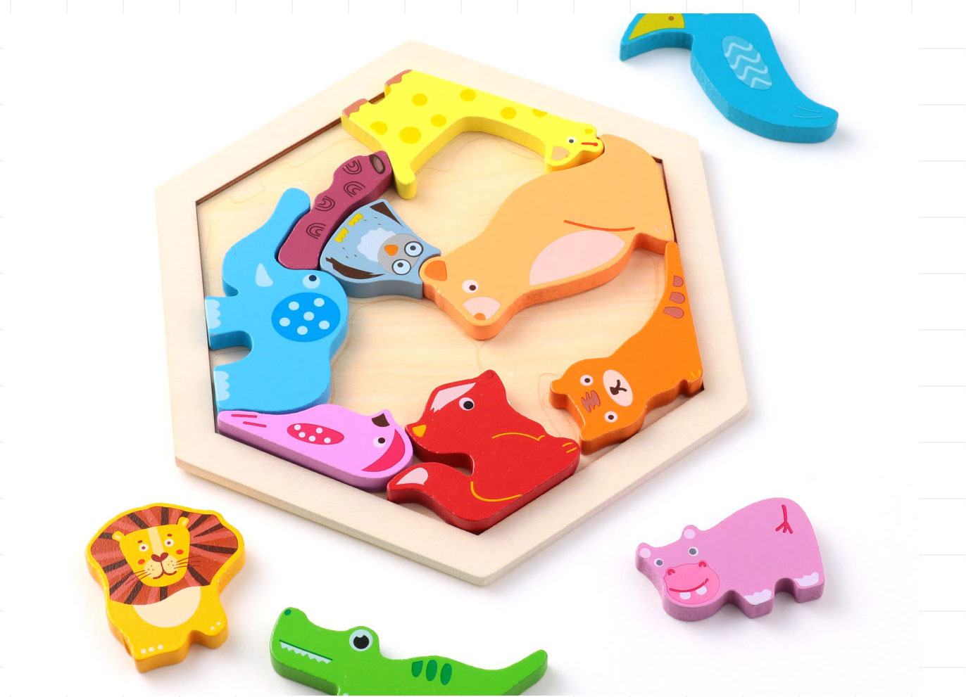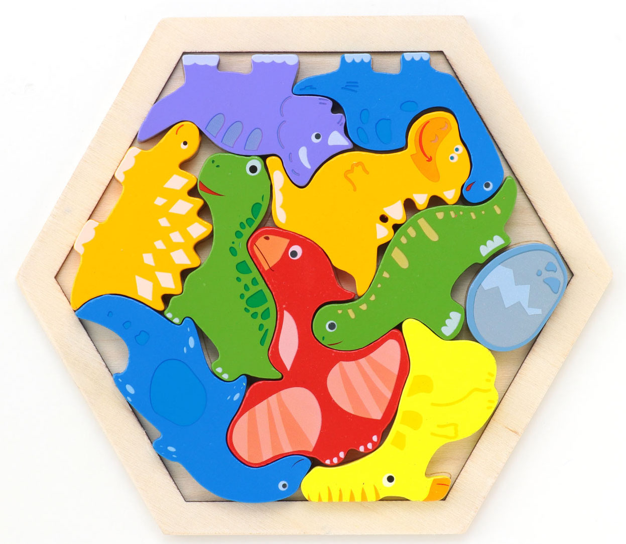 板にプリントされた形に合わせて、六角形いおさめるパズルです。パズルはもちろん、モノの名称を覚えたり、形を触ることでモノの特徴への興味にもつながります。