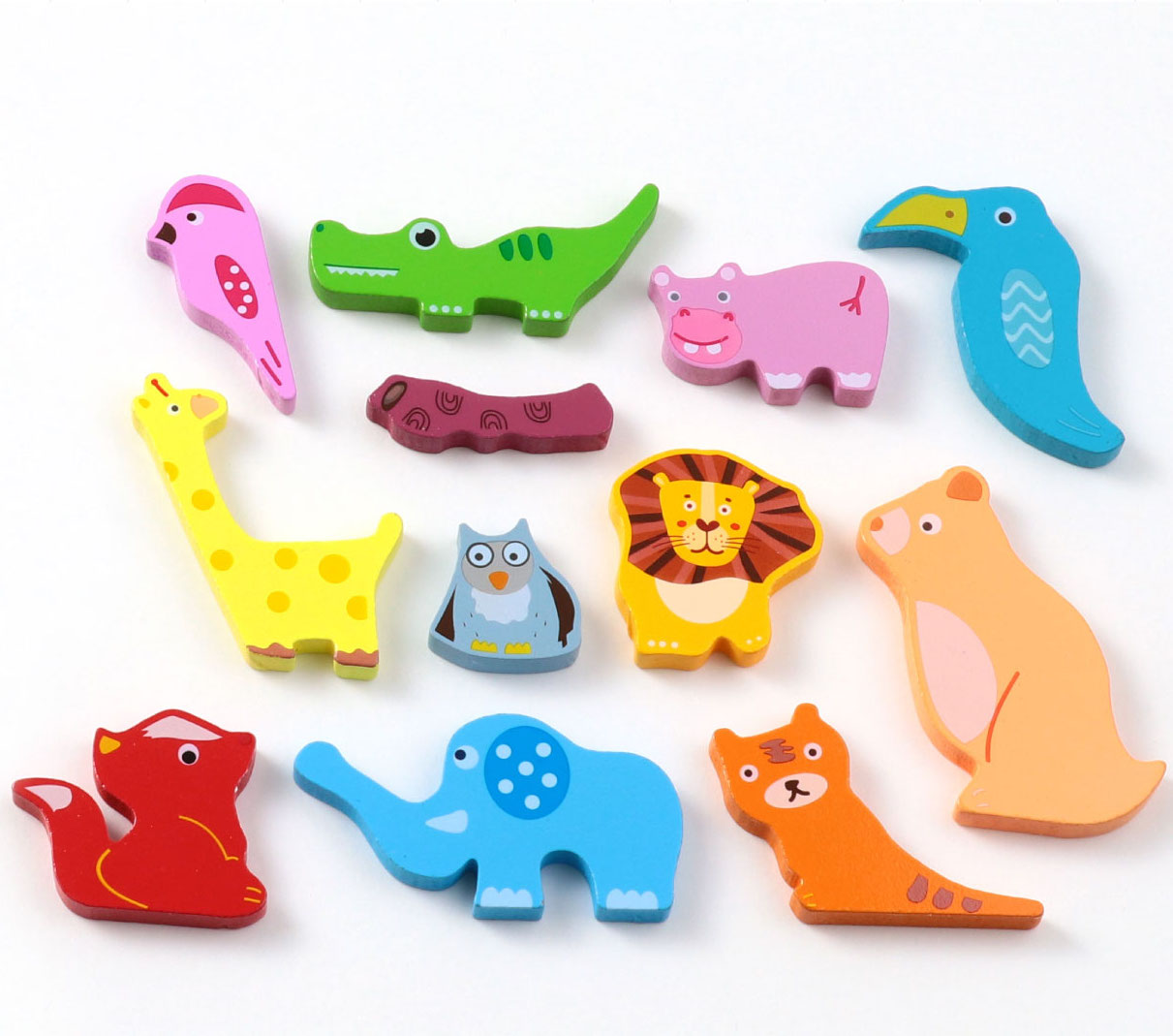 ただ家庭での指導は難しく、また円、三角、四角の無機質な形に親しみをもてず、パズルに取り組もうとしない子もいます。そんな子どもたちが興味を示すのが、身近な食べ物や好きな乗り物やどうぶつなどがモチーフになった型はめや形あわせパズルです。