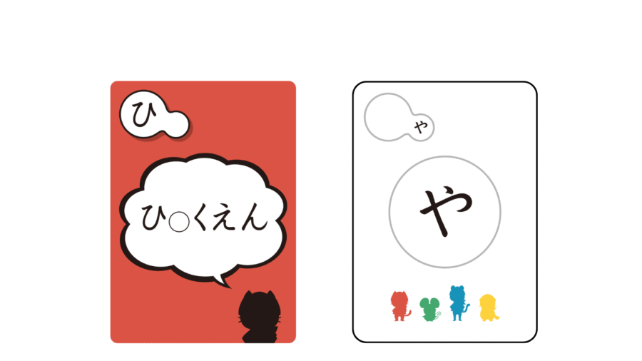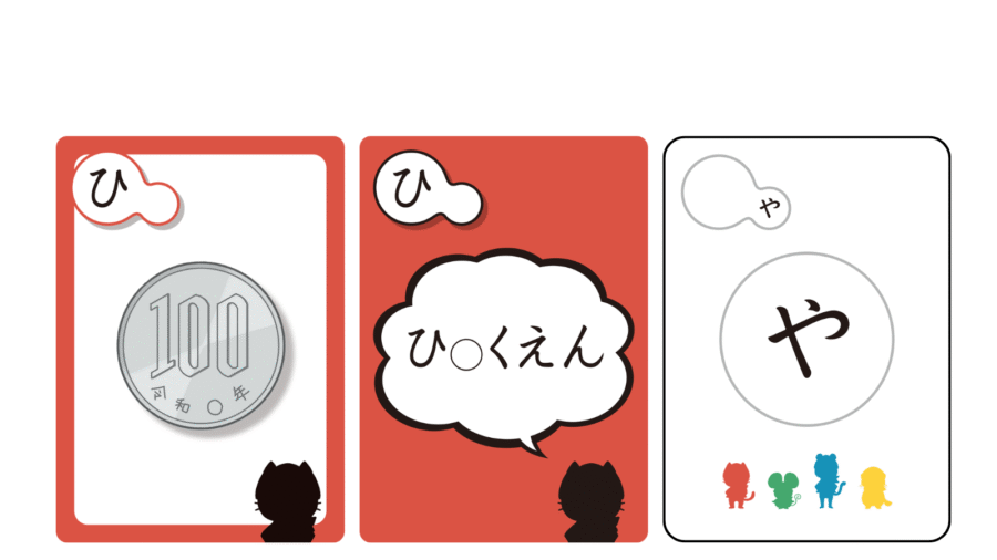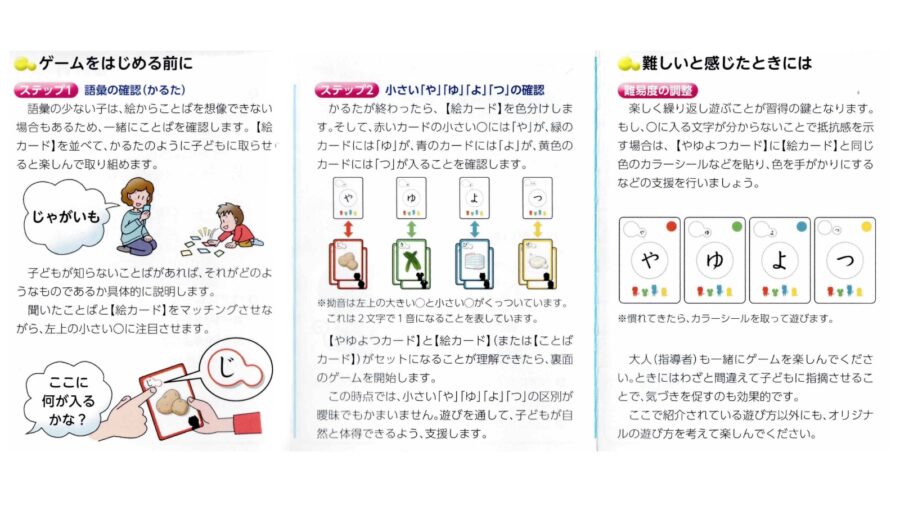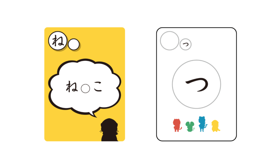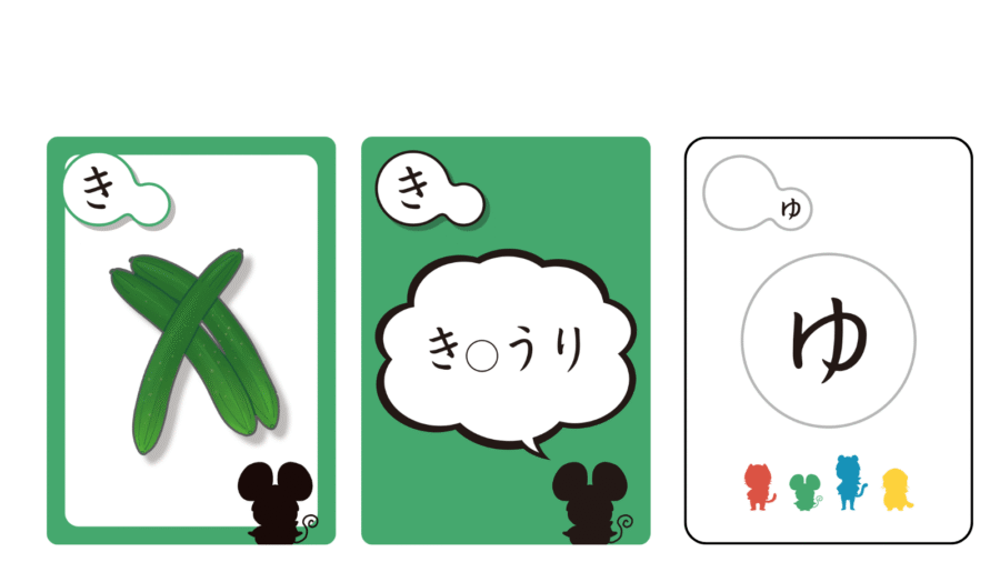 【絵カード】と【ことばカード】は、使われている小さい「や」「ゆ」「よ」「つ」ごとに色分けされています。そのため読みが苦手な子どもでも、色を手がかりに抵抗なく遊べます。また、子どもの理解度に合わせて【絵カード】と【ことばカード】を選んで遊べるのも特徴のひとつです。