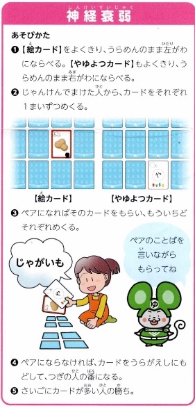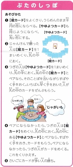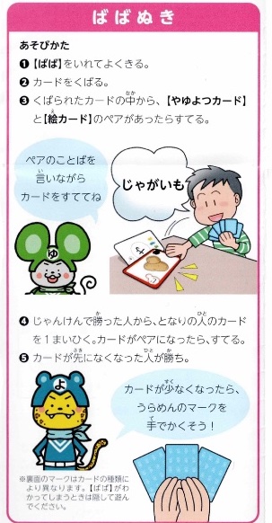 カードを使って「ばばぬき」「神経衰弱」「ぶたのしっぽ」で遊べます。他にもみんなでオリジナルな遊びを考えても楽しいですね。